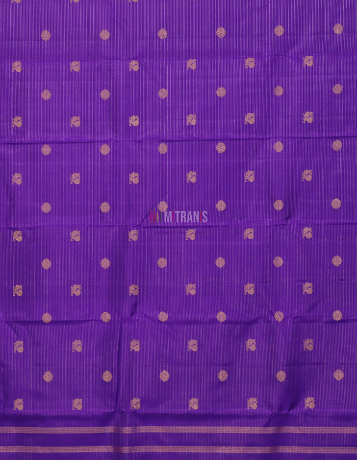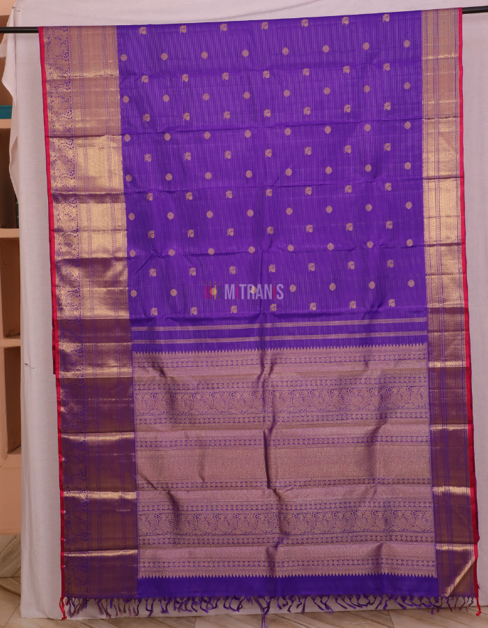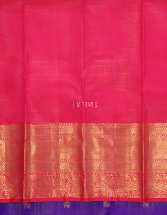 Body: Persian Blue colour Vaira Oosi Kanjivaram Silk Saree with allover 3gm Gold Plated Mayil Chakram Buti; Upper Border Golden 4.5 inch, Bottom Border Golden 9 inch with Rani Selvedge; with Blouse piece