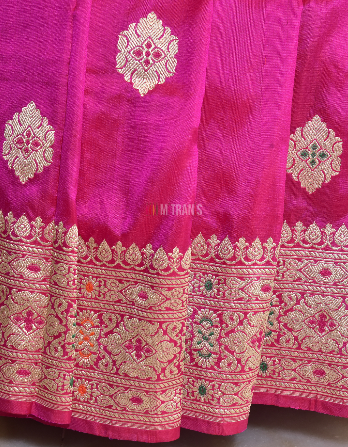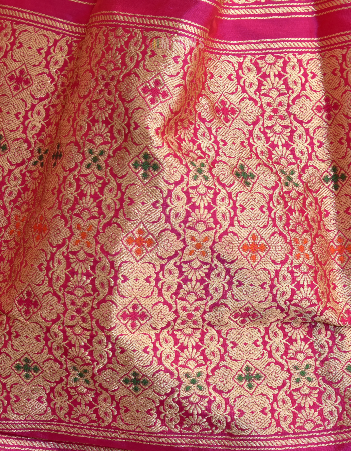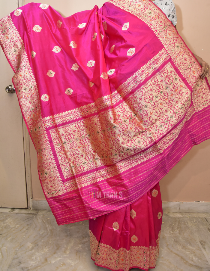 Body: Single Katan Benarasi; Body in Minakari Buti; Pallu and Border in Minakari Golden Zari work; Blouse Piece with Golden Zari stripes;