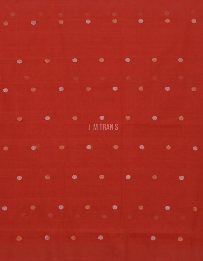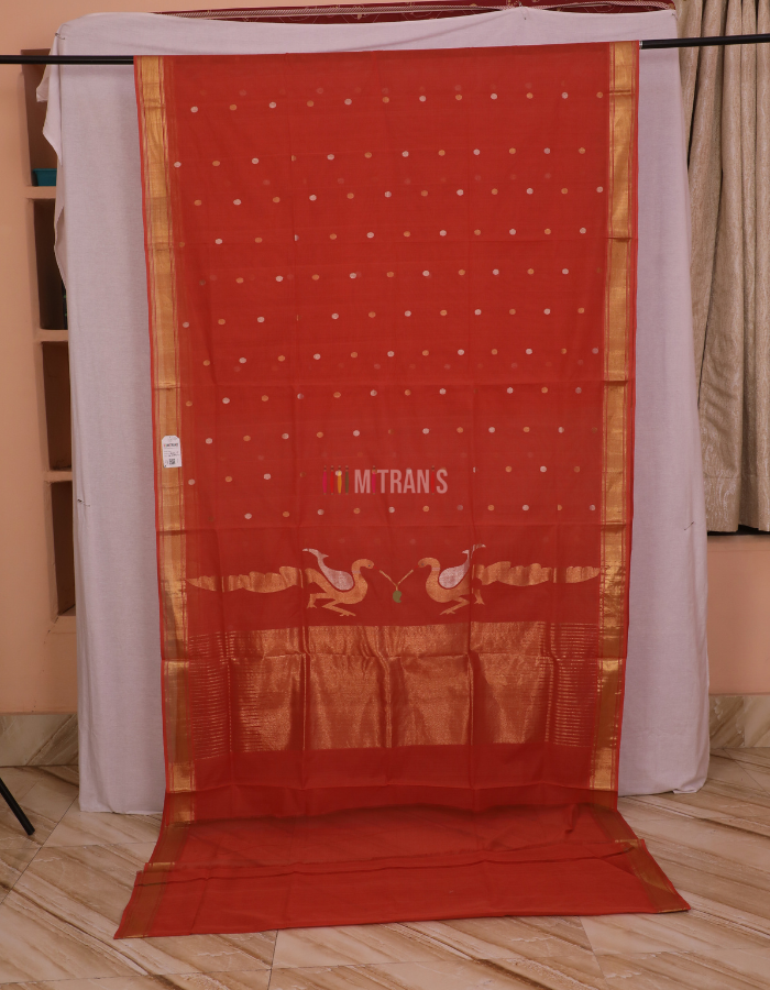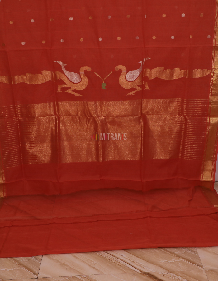 Body: Brick Red colour Venkatgiri Cotton by Cotton with sonarupa jamdani zari motif; Plain Golden Border; with Blouse piece